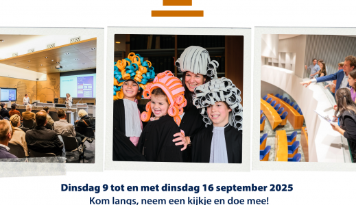 Van 9 tot en met 16 september 2025 openen verschillende organisaties en overheidsinstituten hun deuren voor bezoekers. Zij organiseren diverse activiteiten voor jong en oud om te laten zien wie ze zijn en welke rol ze spelen binnen de rechtsstaat. Ontdek het zelf bij bijvoorbeeld een proefrechtszaak, debat, rondleiding of workshop met rechters en juristen. Het volledige programma vind je op www.weekvanderechtsstaat.nl. Mis daarbij ook het Rondje Rechtsstaat niet op zaterdag 13 september!
